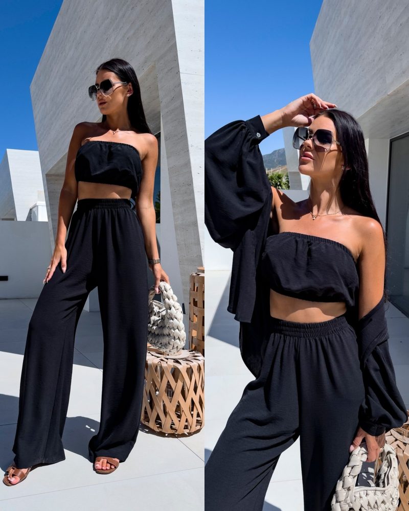 Kreklu, topa un bikšu kombinācija. Krekls ar regulējamu aizdari. Krūšu kabata. Šņores jostasvieta un brīvāks piegriezums.