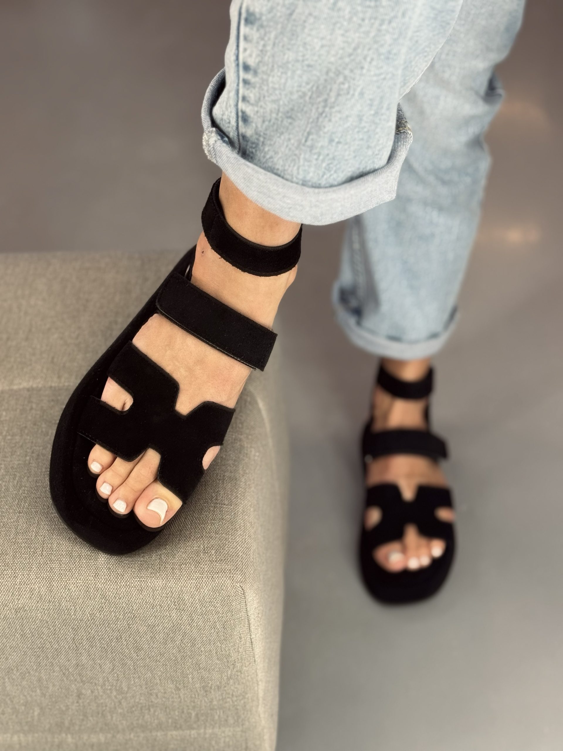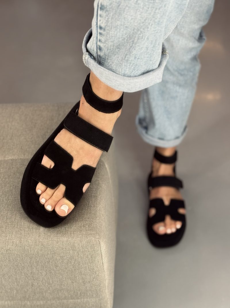 Eko zamšādas sandales, regulējamas ar velcro siksniņām. Neslīdoša zole.