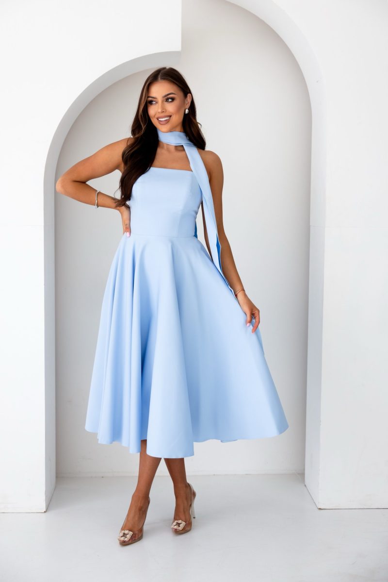 Plašāks piegriezums, trekns viduklis, korsetes formas, pieguloša augšdaļa, midi garums. Aizdares aizdare aizmugurē. Kleitai ir odere.
