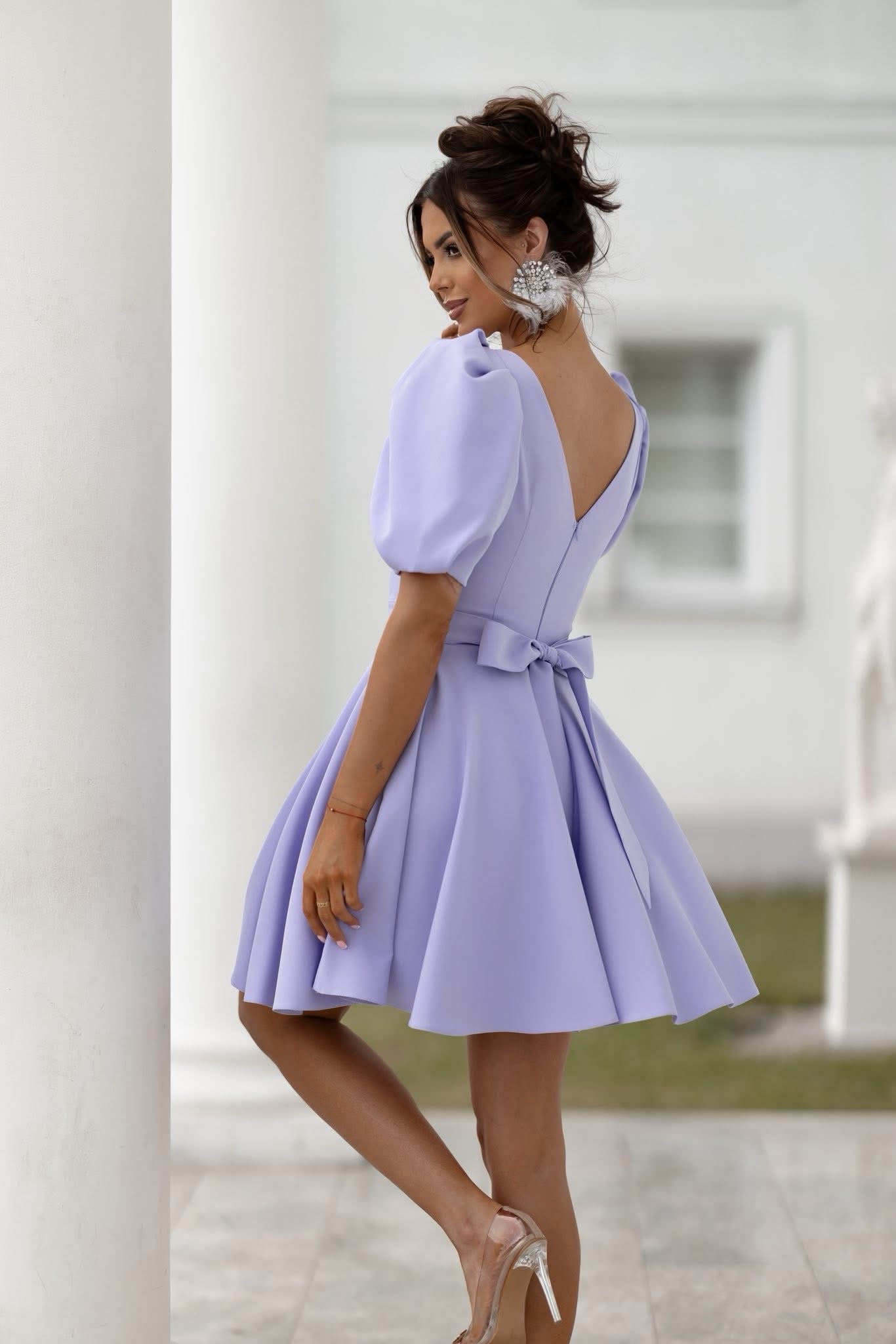 Elegances un meitenīga šarma iemiesojums. Mini piegriezums skaisti atklāj kājas, un lentīte aizmugurē piešķir unikālu izskatu. Tā ir ideāla izvēle kāzām, kristībām, komūnijai vai romantiskām tikšanās reizēm.