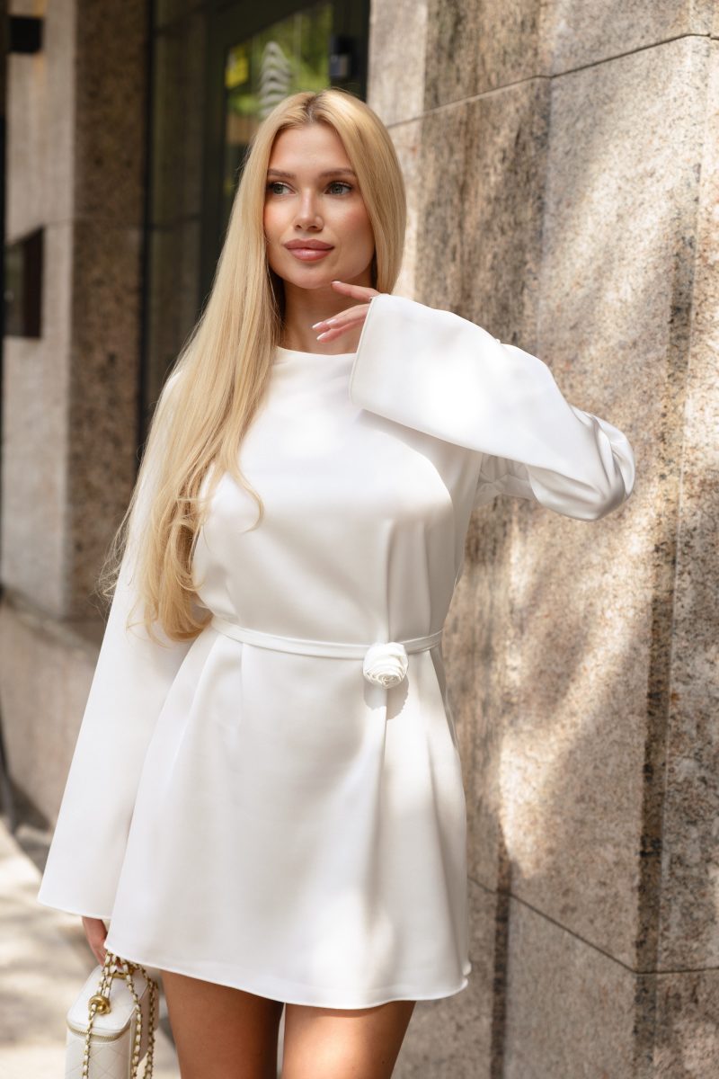 Grezna mini kleita no augstas kvalitātes dubultā zīda, kas skaisti izceļ figūru. Vienkāršais, bet elegantais piegriezums ar garām piedurknēm un jostu ar dekoratīvu rozi rada izsmalcinātu un modernu izskatu. Lieliski piemērota īpašiem gadījumiem.