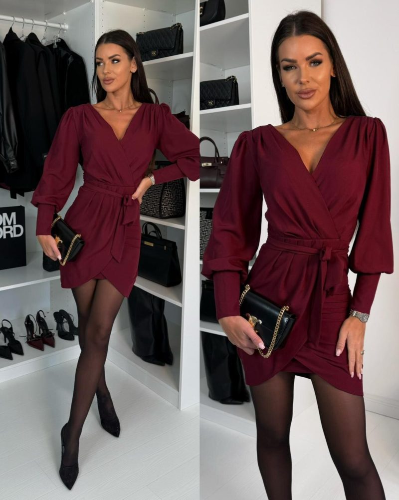 70 % viskoze, 30 % poliesters Daudzslāņains piegriezums, josta akcentēta ar jostu. V veida izgriezums.