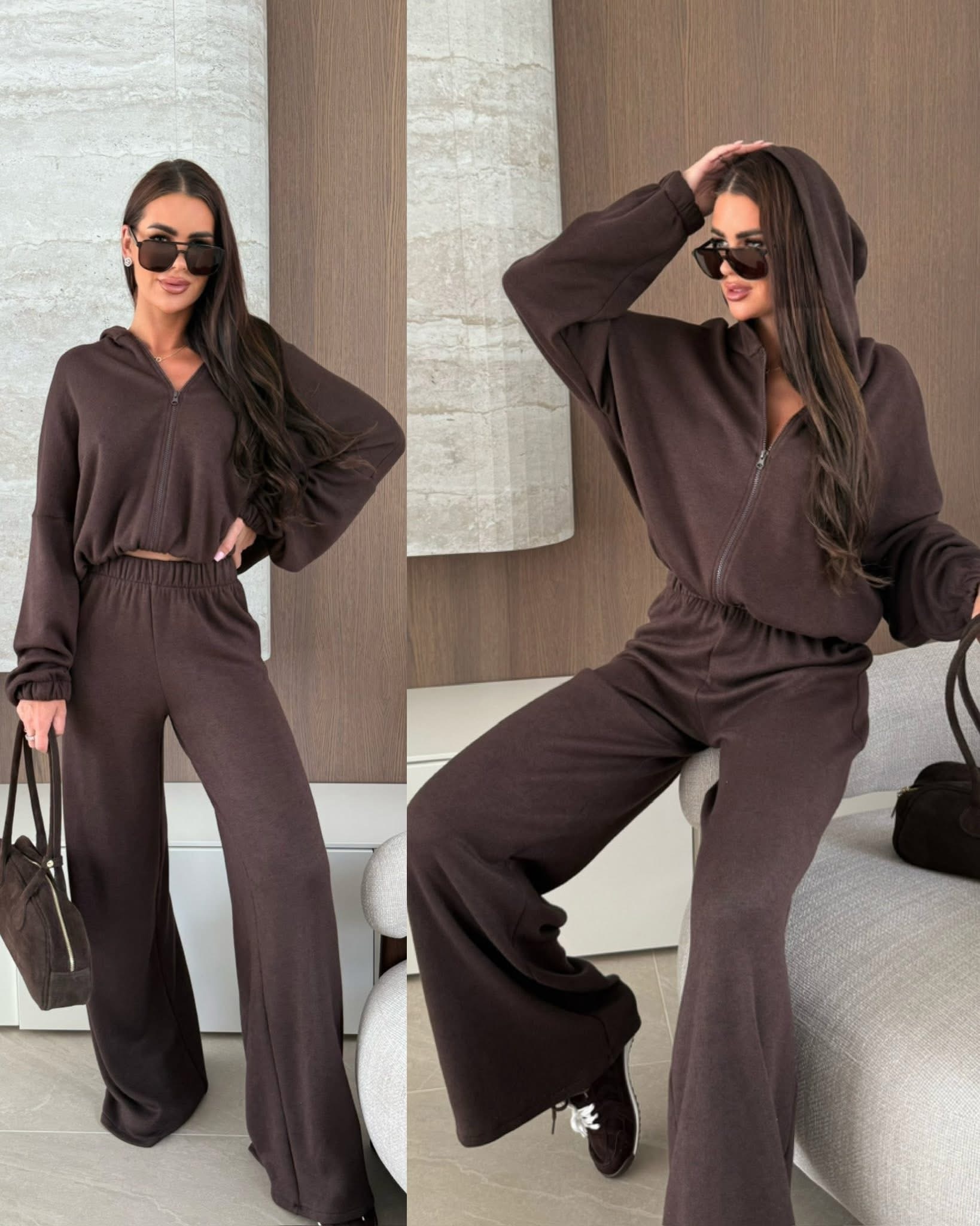 Trikotāžas džemperis + bikšu komplekts. Džemperis ar rāvējslēdzēju. Plaša piegriezuma kājas. Elastīga josta.