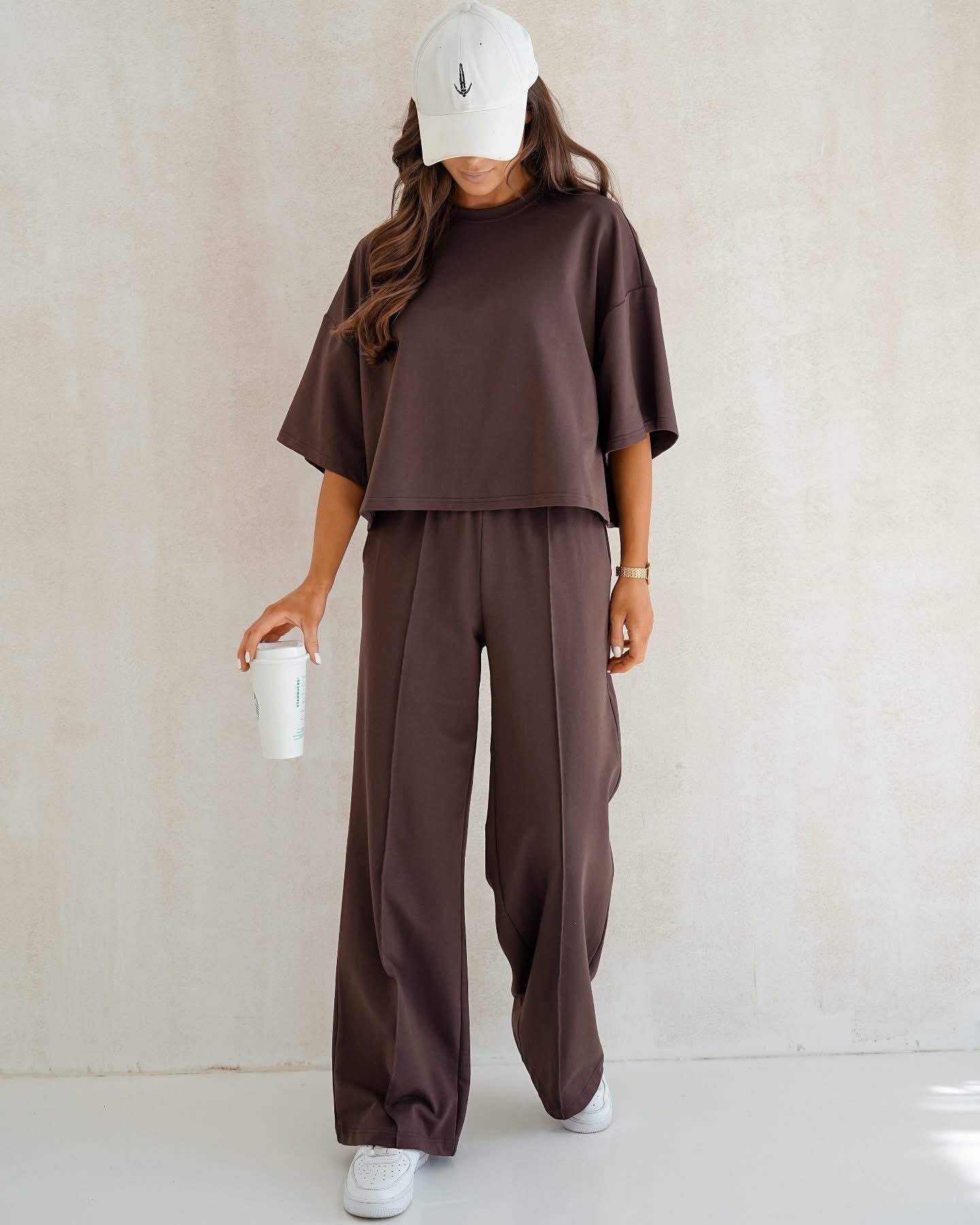 Īsāka blūze un bikses ar augstu vidukli un kabatām. Elastīgs materiāls