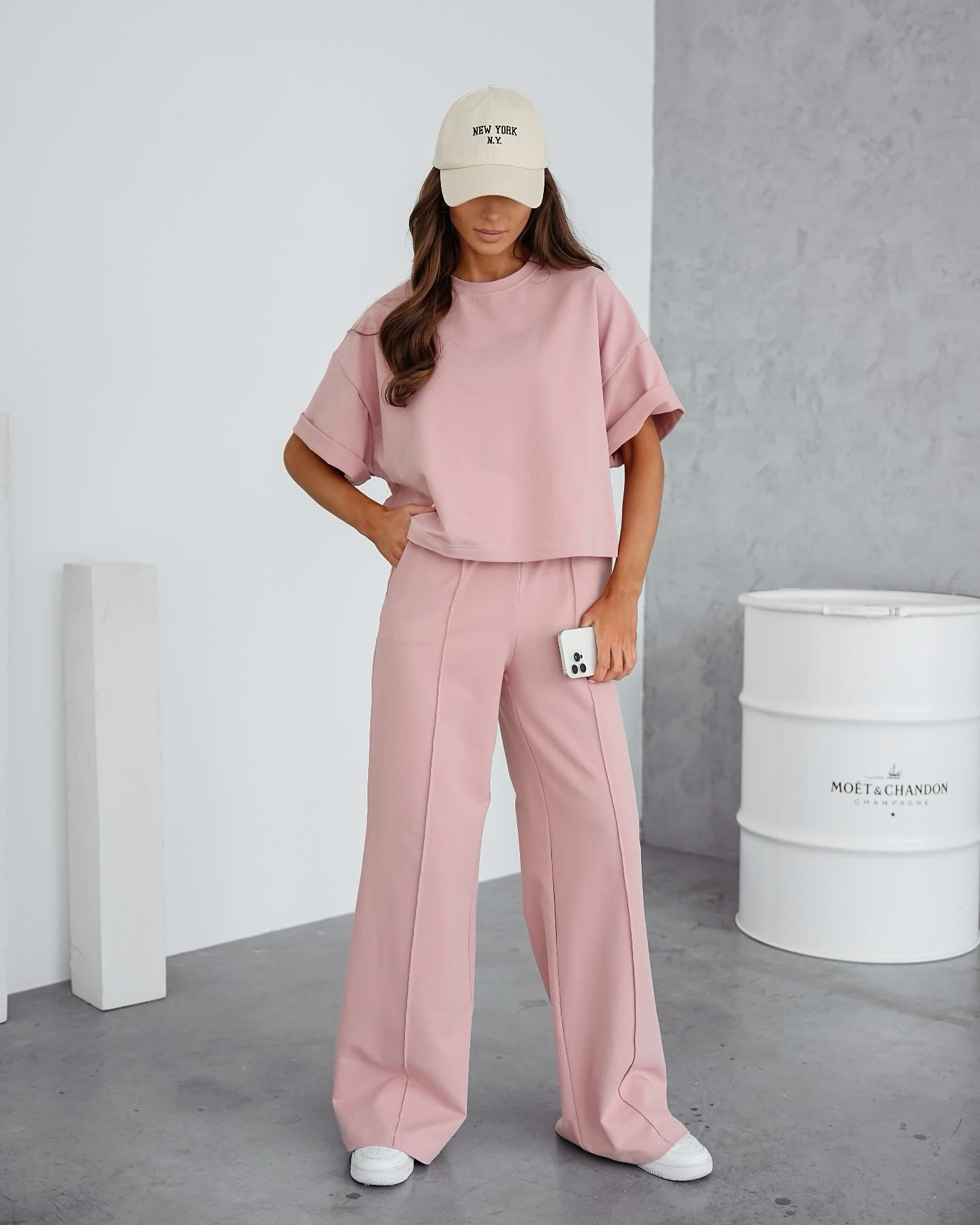 Īsāka blūze un bikses ar augstu vidukli un kabatām. Elastīgs materiāls