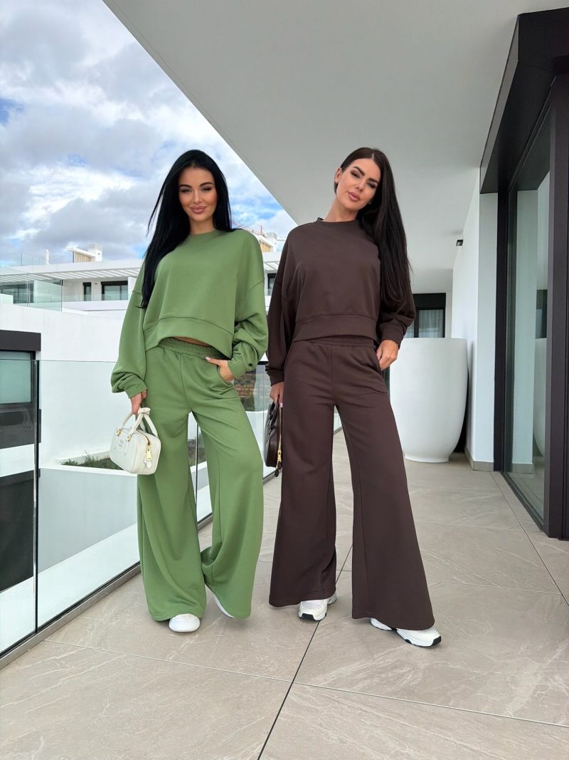 Īsāka piegriezuma džemperis + bikses ar elastīgu jostu. Gluda virsma. Izgatavots no ērta auduma.