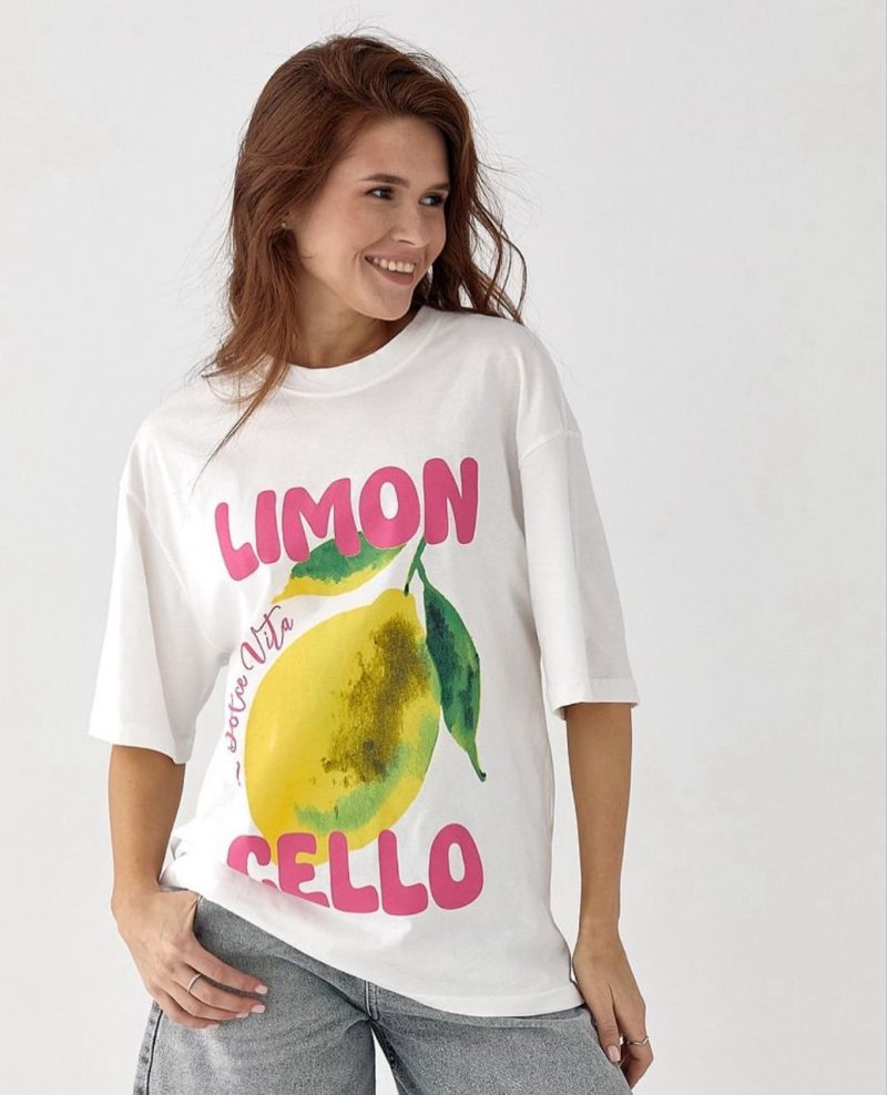Izgatavots no auduma, kas ir patīkams pieskārienam. Uz pleca ir uzraksts. Apaļš izgriezums. Pazemināta plecu līnija.