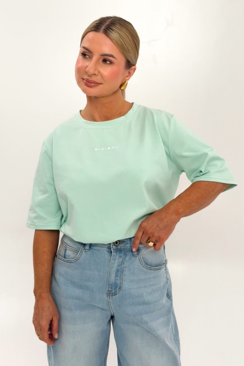 Minimāls T-krekls no gluda auduma. Tam ir minimālisma stila apdruka. Vaļīgs piegriezums nodrošina valkāšanas komfortu.