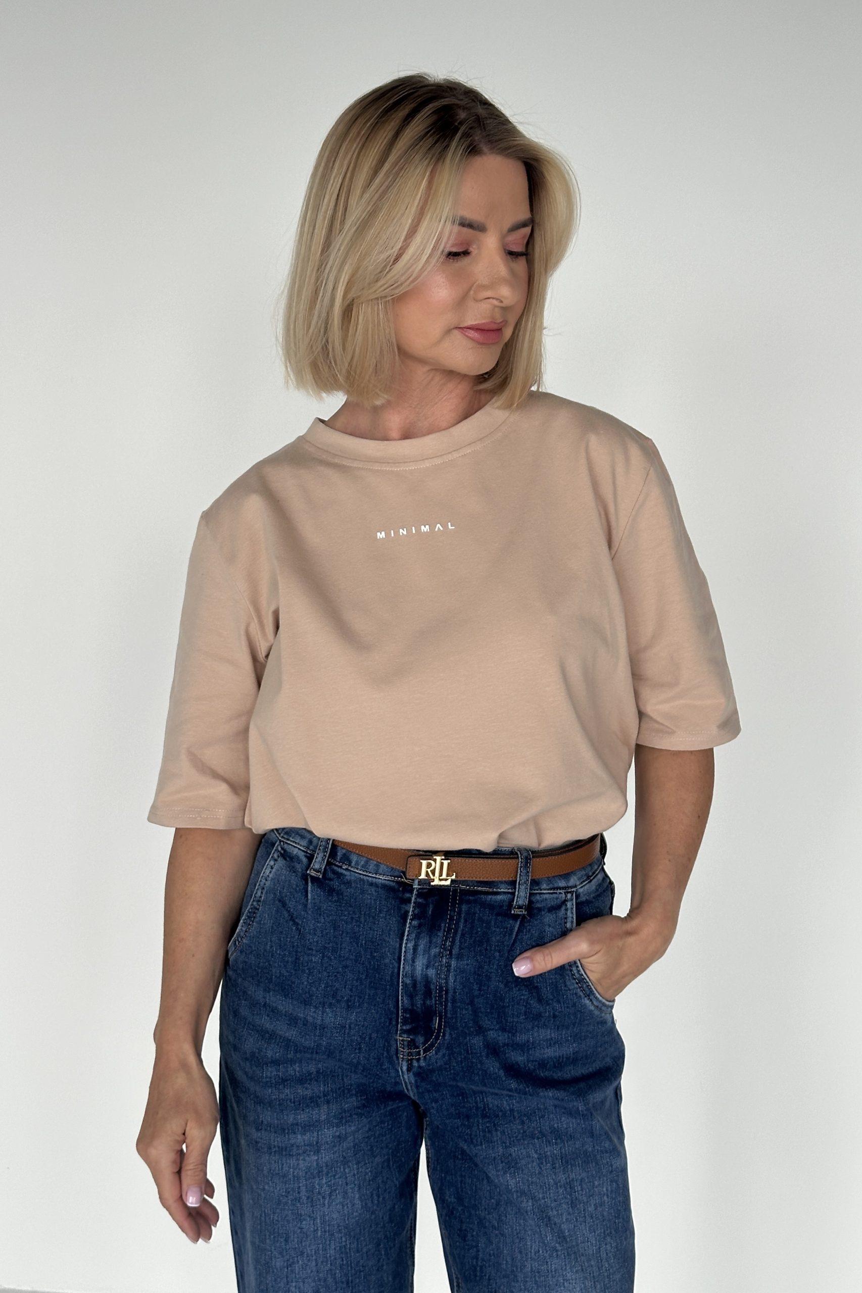 Minimāls T-krekls no gluda auduma. Tam ir minimālisma stila apdruka. Vaļīgs piegriezums nodrošina valkāšanas komfortu.