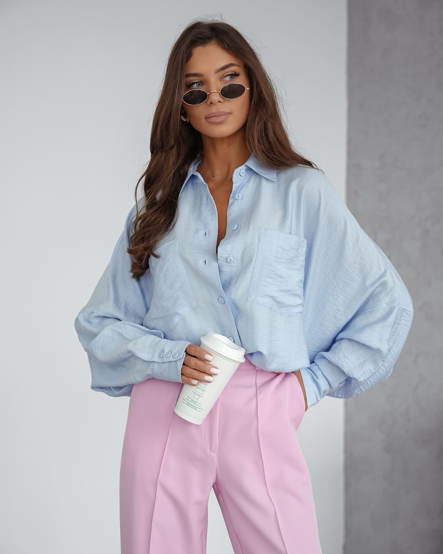 Elegants lielizmēra T-krekls. Divas priekšējās kabatas, aizdare ar pogām.