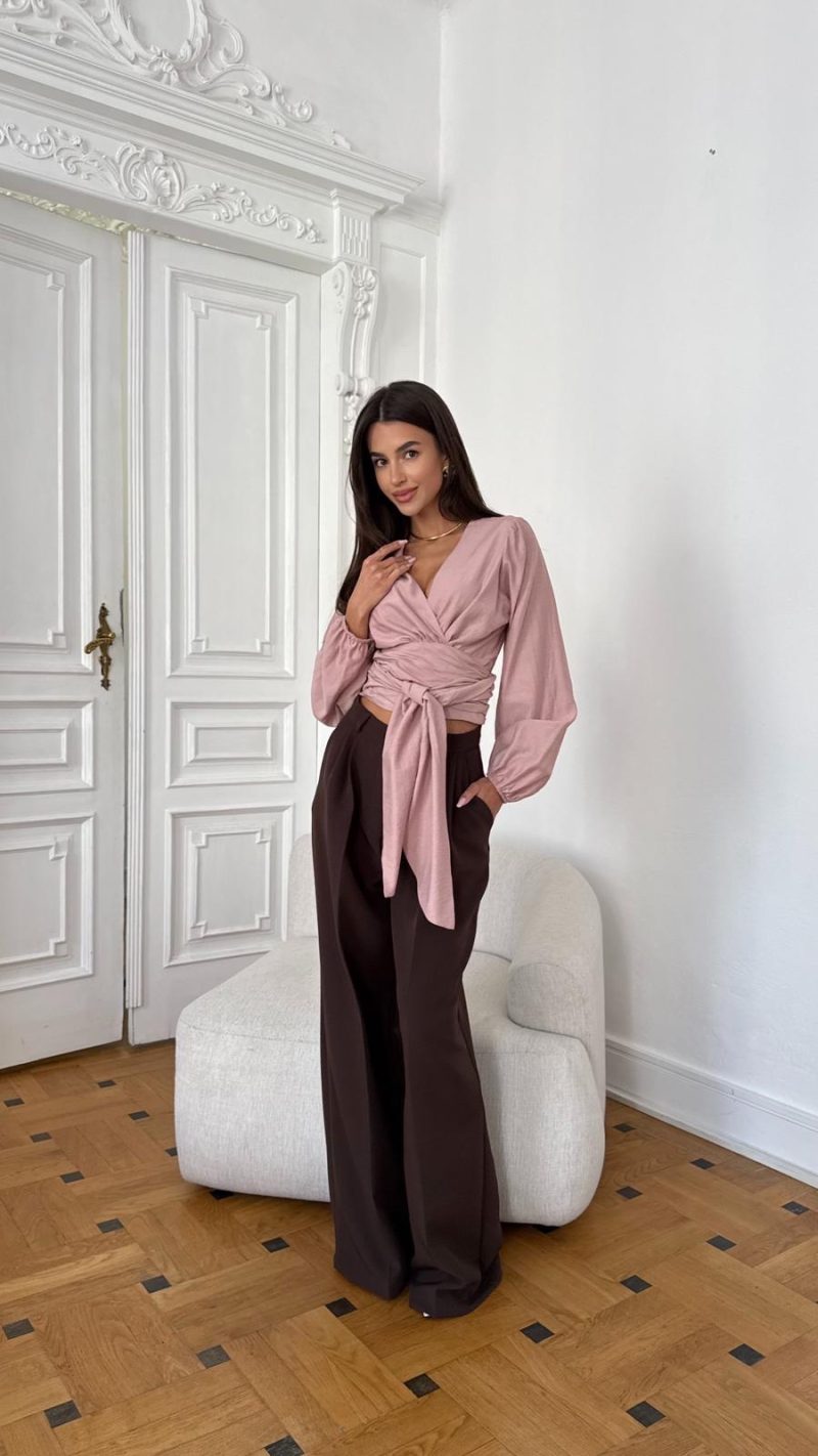 Augšdaļa ar regulējamu jostu. Daudzslāņains izgriezums. Viegls audums ar zīda sajūtu.