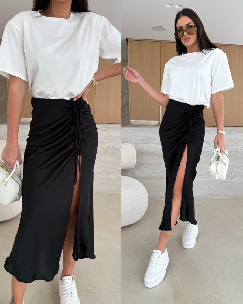 Slaids un viegls materiāls, midi garums ar šķēlumu un savelkamu aukliņu, lai pielāgotu piegulošo daļu. Elastīga jostasvieta.