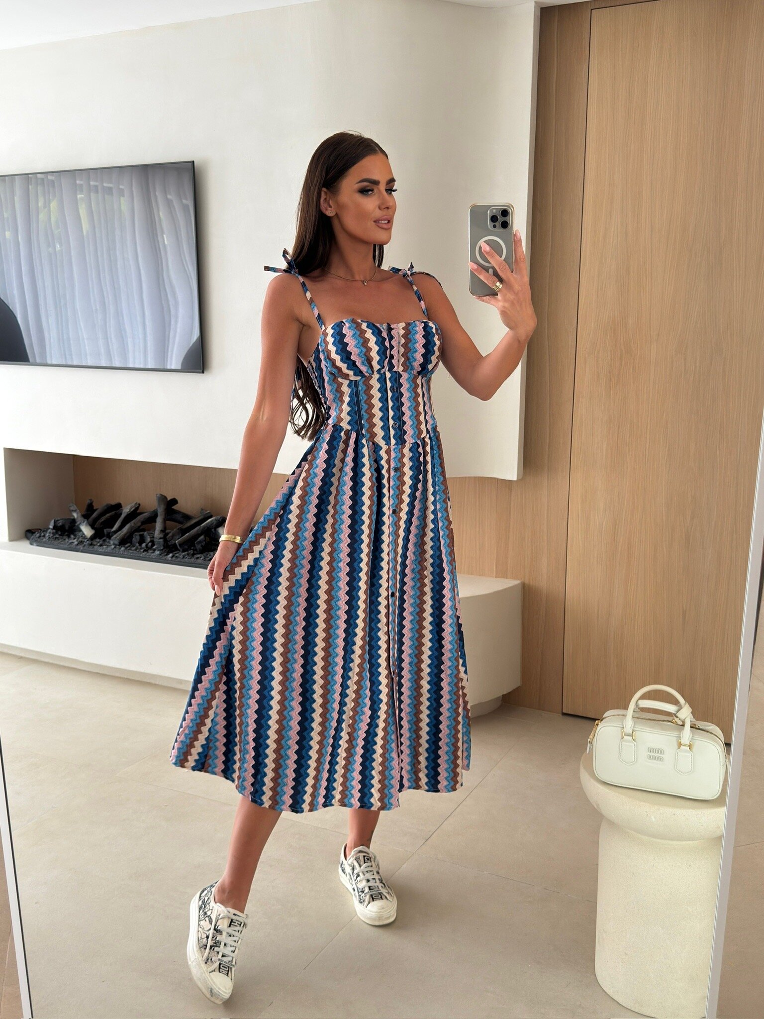 Midi garums, ziedu raksts. Sievišķīgs piegriezums. Kleitai ir krūštura balsta krūšdaļas stiprinošas bļodiņas. Garums regulējams ar aukliņām.