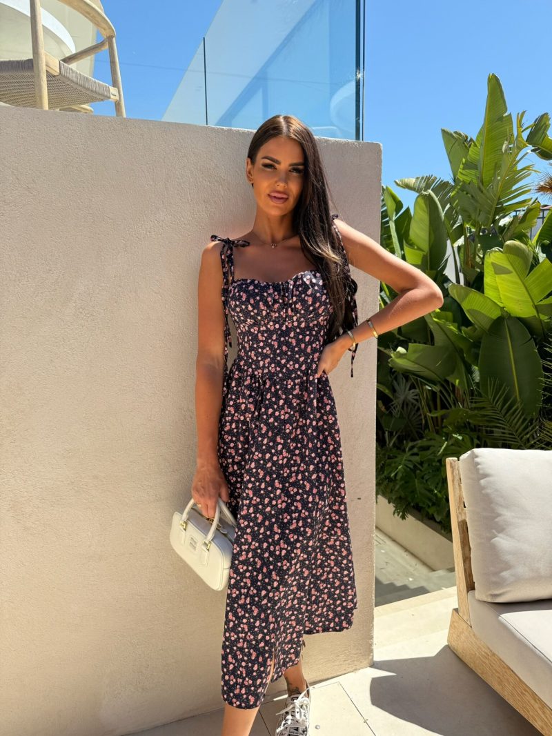 Midi garums, ziedu raksts. Sievišķīgs piegriezums. Kleitai ir krūštura balsta krūšdaļas stiprinošas bļodiņas. Garums regulējams ar aukliņām.