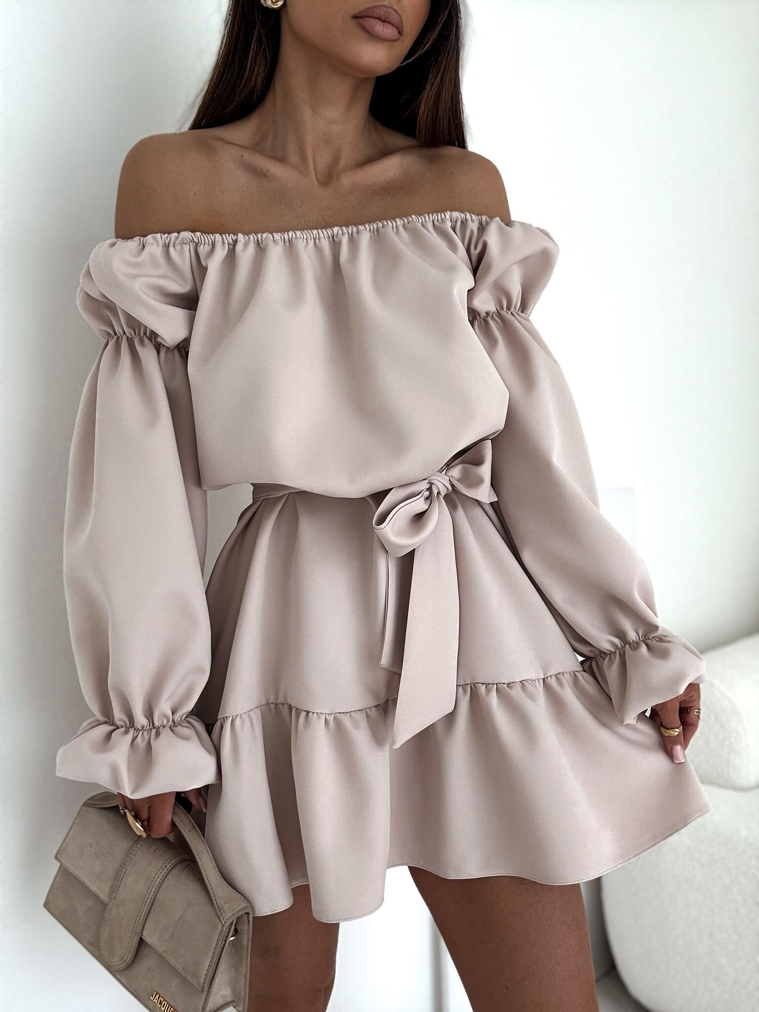 Elegants apģērbs ar garām piedurknēm. Izgatavots no formāla materiāla, kas izceļ modeļa eleganci.