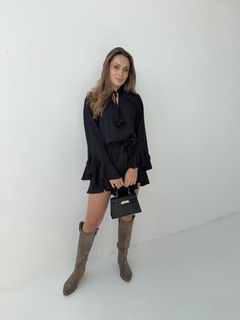 Charmo kleita ir izsmalcinātības un izteiksmīga stila apvienojums. Brīvais piegriezums ar mežģīnēm pie kakla izgriezuma un volāniem uz piedurknēm un apakšmalu piešķir siluetam vieglumu un maigu šarmu. Tā ir izgatavota no 100 % mīksta Tencel – materiāla, kas pazīstams ar savu vieglumu, elpojamību un cēlo apdari – un nodrošina komfortu visas dienas garumā. Tā skaisti ietērpjas un lieliski izskatās kustībā. Izgriezums viduklī pielāgojas figūrai un izceļ sievišķīgas formas. Tā ir ideāla kleita jebkurai sezonai – kombinējiet ar zābakiem, potītes zābakiem vai sandalēm.