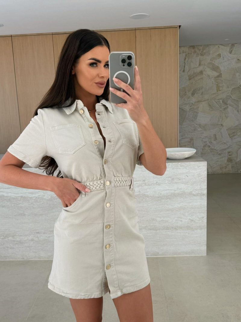 Izgatavotas no džinsa auduma, ar drosmīgu jostasvietu. Regulējama pogas aizdare. Īsas piedurknes un īss garums.