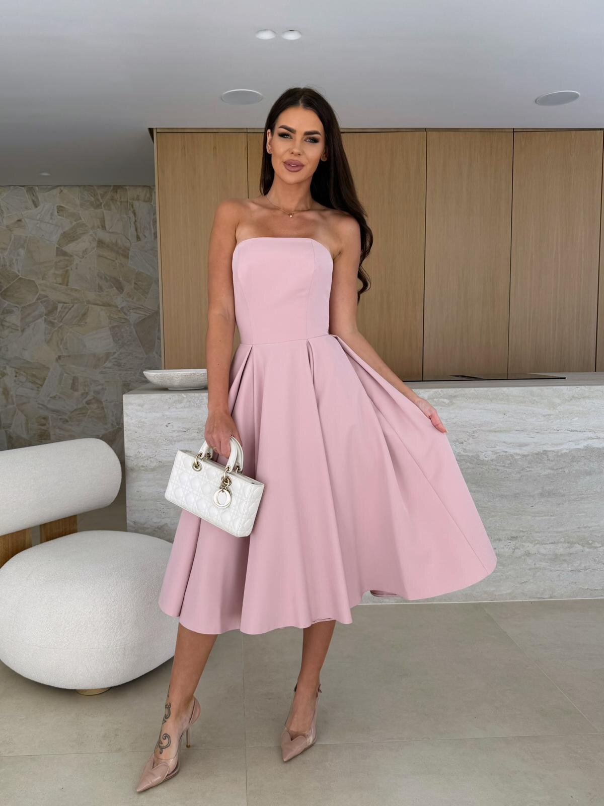 Plašāks piegriezums, trekns viduklis, korsetes formas, pieguloša augšdaļa, midi garums. Aizdares aizdare aizmugurē. Kleitai ir odere.