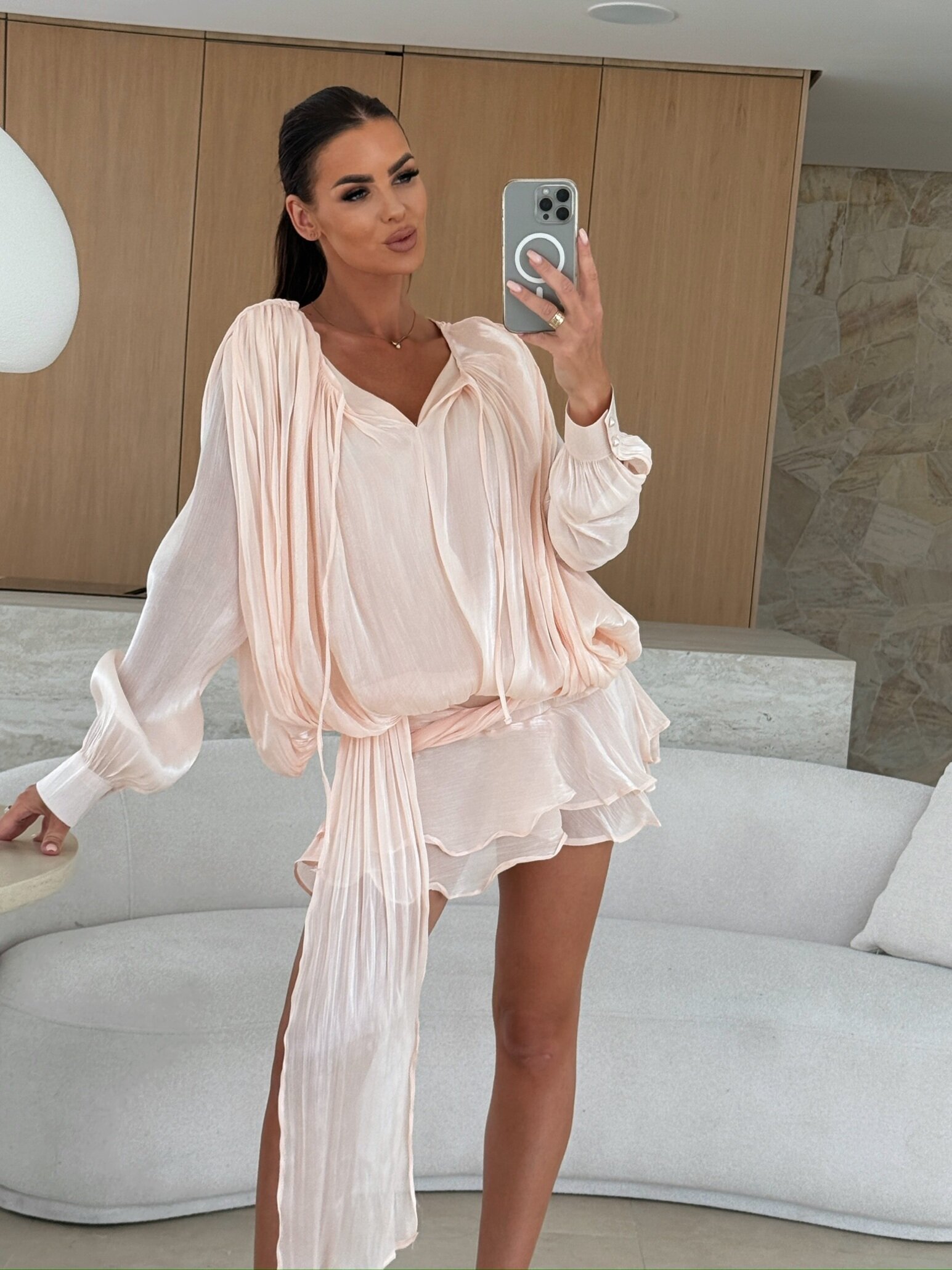 Kleita no grezni spīdīga auduma. Izturīgs pret krokām. Krēmkrāsas krāsa ir piemērota arī kāzu viesiem.
