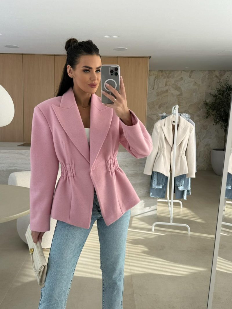 Klasisks garums, elastīga josta. Plecu spilventiņi. Regulējama pogas aizdare.