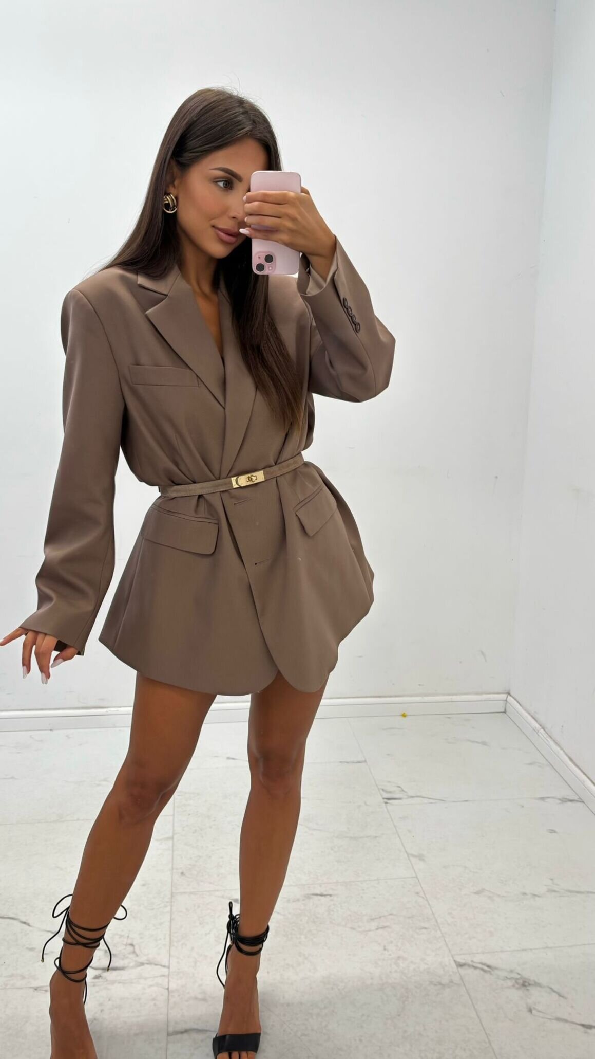 Gluda apdare, elegants dizains, brīvs piegriezums. Regulējama pogas aizdare. Jaka ar oderi un plecu spilventiņiem. Josta nav pievienota.