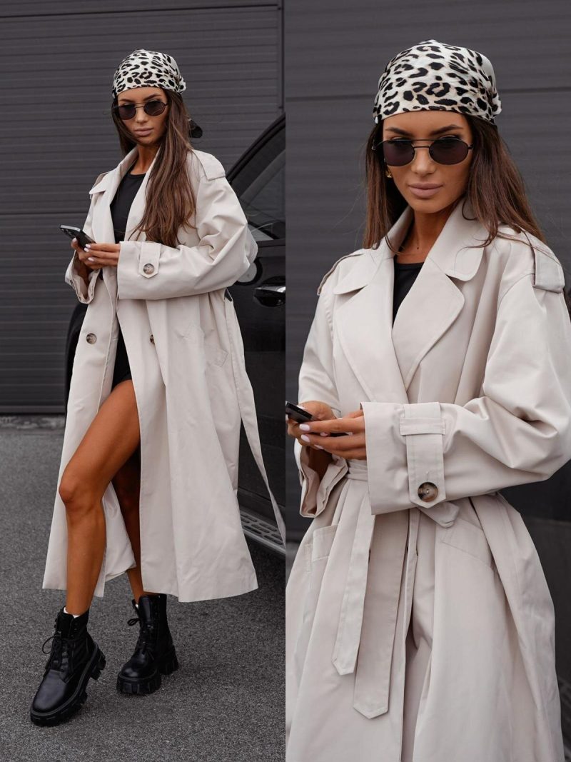 Dubultā aizdare, regulējams viduklis ar savelkamu aukliņu. Gluda virsma. Garums. Mētelis ar oderi. Ietver jostu.